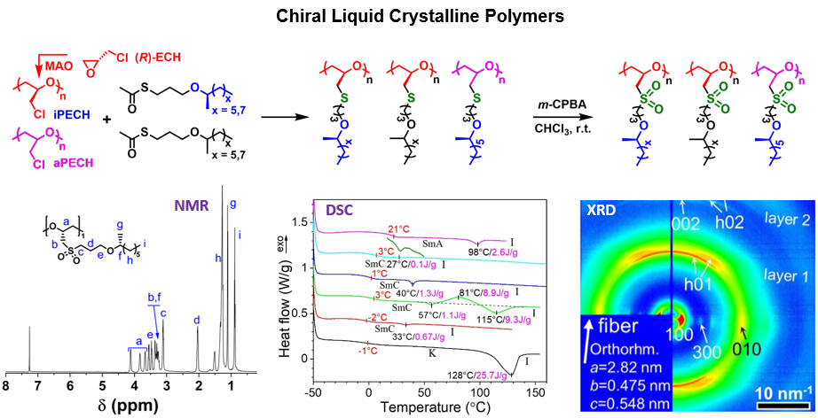Chiral liquid crystalline polymers (LCPs) hold potential in electronic and electrooptical applications. However, traditional chiral smectic C (SmC*) LCPs display rather small spontaneous polarization (Ps) due to the use of bulky aromatic mesogens and weak dipolar groups, which has effectively hindered the practical use of ferroelectric LCPs. To seek large Ps, we are designing and synthesizing mesogen-free LCPs in collaboration with Professor Lei Zhu of Case Western Reserve University by incorporating highly dipolar sulfonyl groups into the alkyl side chains of polyethers. To induce the formation of SmC* phases, we introduce chiral centers into either the polymer backbone or aliphatic side chains or both. Ring-opening polymerization is useed to prepare comb-like mesogen-free LCPs along with post-polymerization modification reactions. These polymers are characterized by 1H and 13C NMR spectroscopy, size exclusion chromatography, polarimetry, and thermogravimetric analysis, and their liquid crystalline behavior and structures are investigated by differential scanning calorimetry, synchrotron X-ray diffraction, and polarized light microscopy.