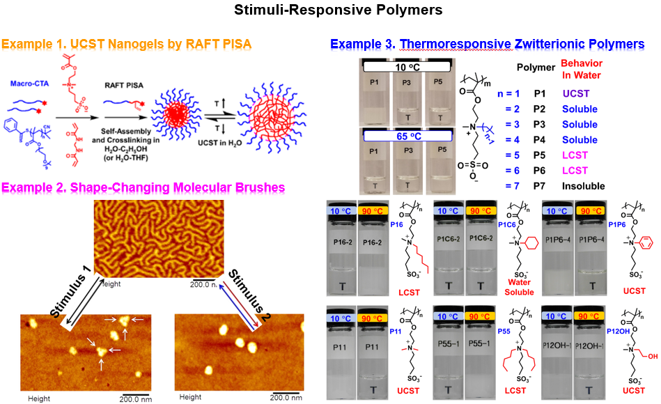 Stimuli-responsive polymers undergo large and abrupt physical or chemical changes, often accompanied with a drastic solubility variation in solvents, in response to external stimuli. The changes can be reversible or irreversible, and various stimuli-responsive (temperature, pH, light, specific species, and mechanical force) polymers have been reported. We are especially interested in: (i) thermoresponsive zwitterionic polymers that display lower critical solution temperature (LCST) and upper critical solution temperature (UCST) transitions in water, (ii) zwitterionic hairy nanogels and microgels, (iii) specific ion-responsive polymers, and (iv) stimuli-responsive shape-changing bottlebrush polymers. The following shows examples of UCST thermoresponsive hairy nanogels, stimuli-responsive shape-changing molecular bottlebrushes, LCST and UCST thermoresponsive zwitterionic polymers.